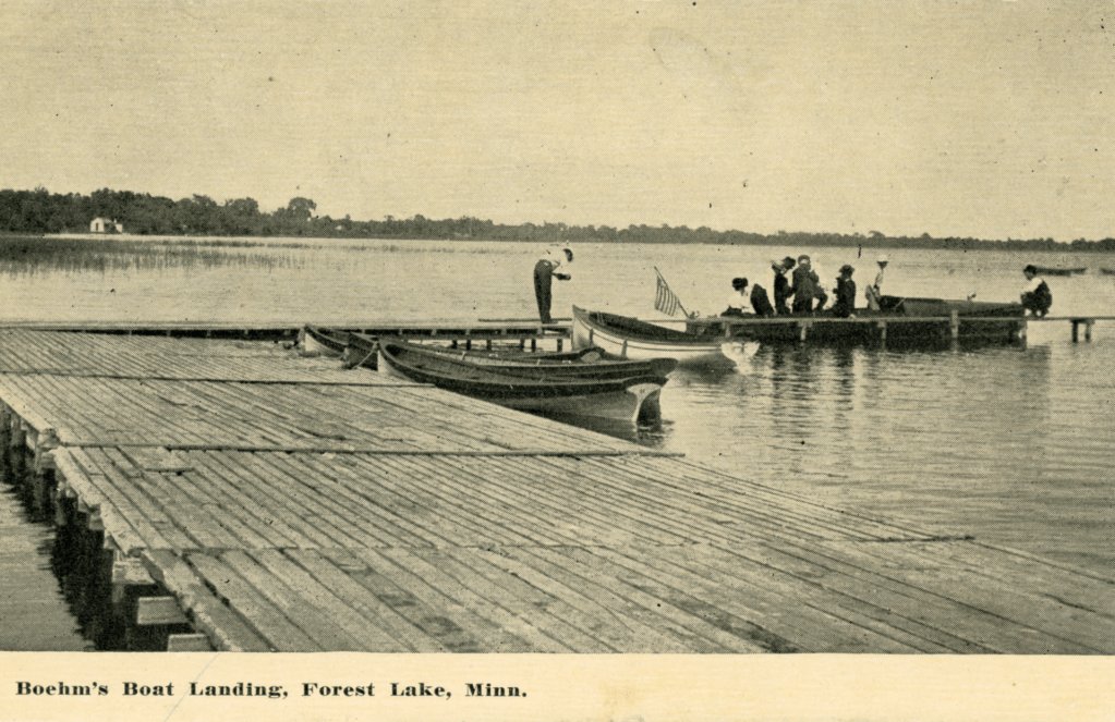 Before the days of outboard motors and depth finders, people from larger cities would come to Forest Lake, much as we would visit the Boundary Waters today. It was a place to unwind, unplug and relax in solitude. There were no homes on the lake as we know it today. Aside from the train depot and general store, there was very little to see besides water and trees. In the St. Paul newspaper from July of 1870, we read that “Chief Justice Chase, Judges Ripley, Berry and McMillan and others went out to Forest Lake today for a fishing excursion.” Another reads, “Rev. Otis and others have gone to Forest Lake to spend a week or two hunting, fishing, roughing it and rusticating generally.”